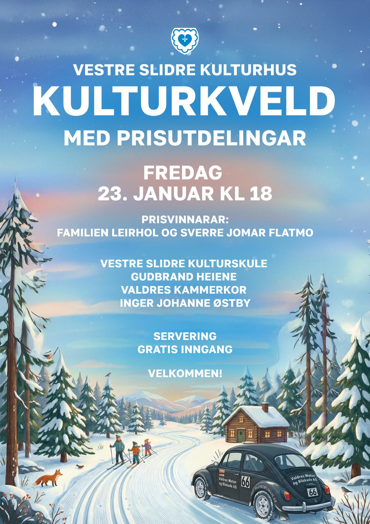 Velkomen til ein triveleg og innhaldsrik kveld i Vestre Slidre kulturhus fredag 23. januar kl. 18.00Denne kvelden feirar vi årets prisvinnarar: